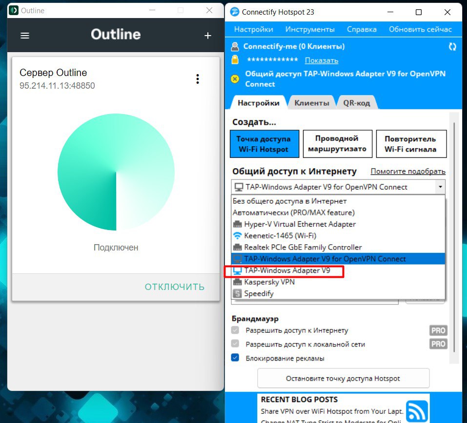 2. Запустить connectify hotspot и из выпадающего меню "Общий доступ к интернету" выбрать виртуальную сеть от Outline, как на картинке.