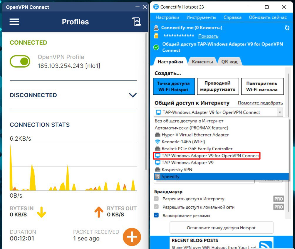 2. Запустить connectify hotspot и из выпадающего меню "Общий доступ к интернету" выбрать виртуальную сеть от OpenVPN, как на картинке.