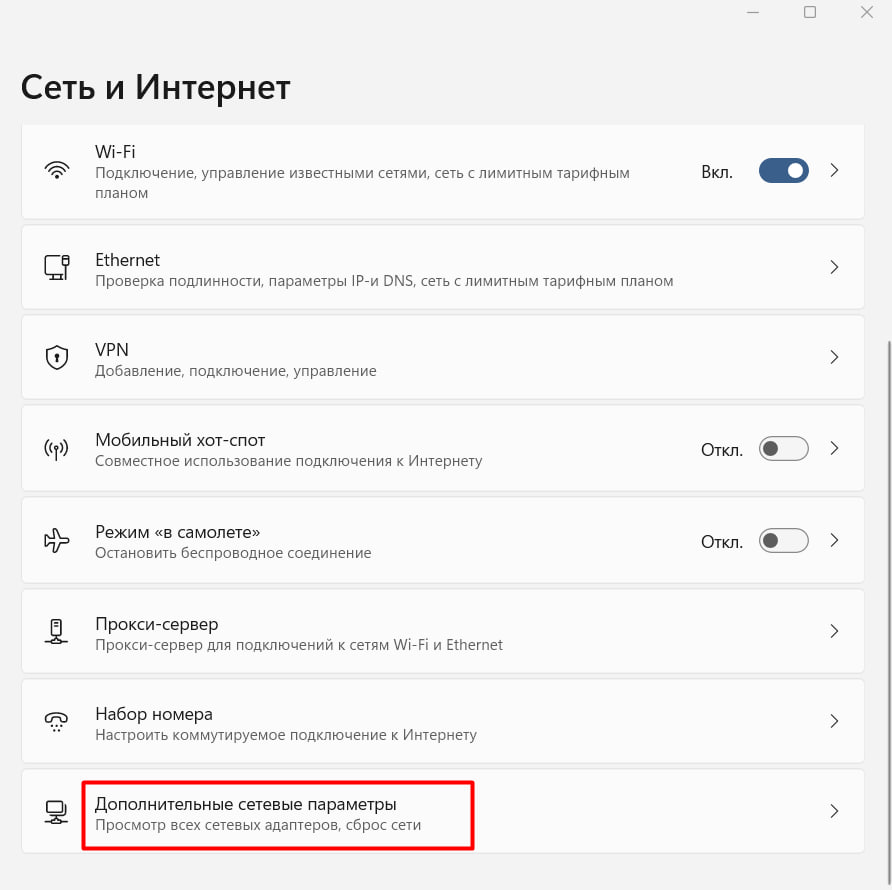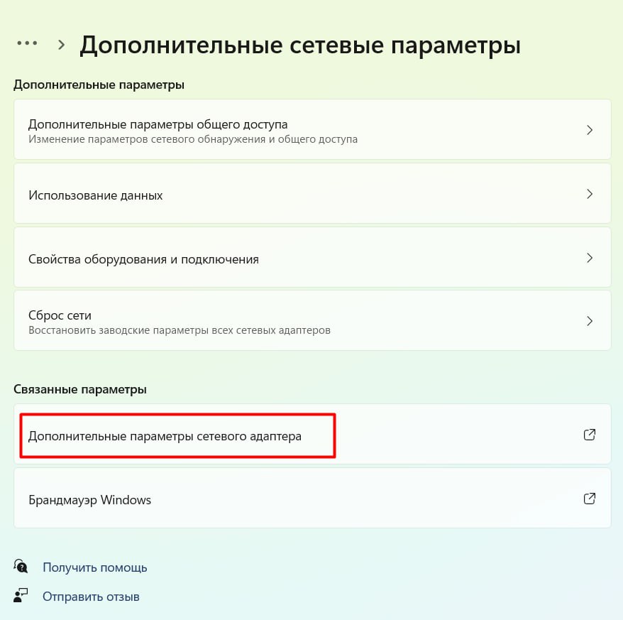 3. Зайти в настройки -> Сеть и интернет -> Дополнительные сетевые параметры и нажать Дополнительные  параметры сетевого адаптера