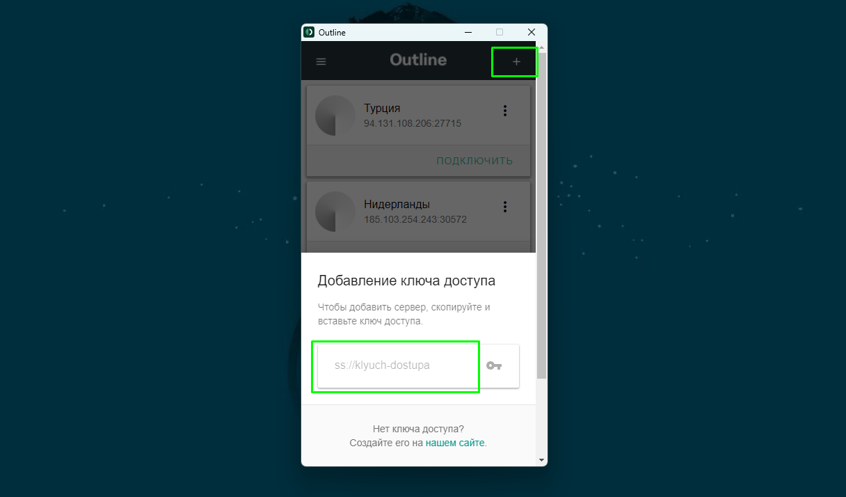 Устанавливаем, запускаем и нажимаем в верхнем правом углу "+" в появившемся окне вставляем ключ доступа и нажимаем "Подключить"