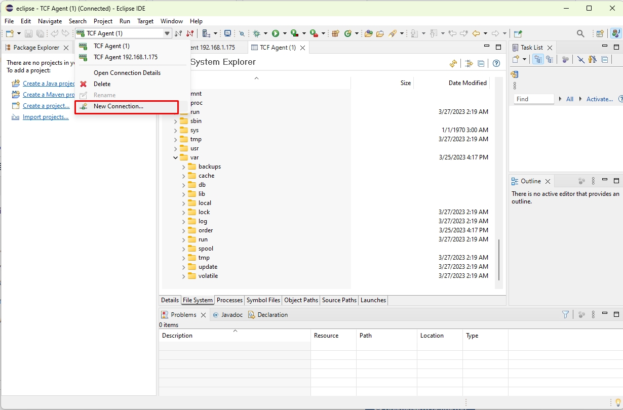 12. Когда eclipse перезапустится, на верхней панели должна появиться новая опция «New connection».