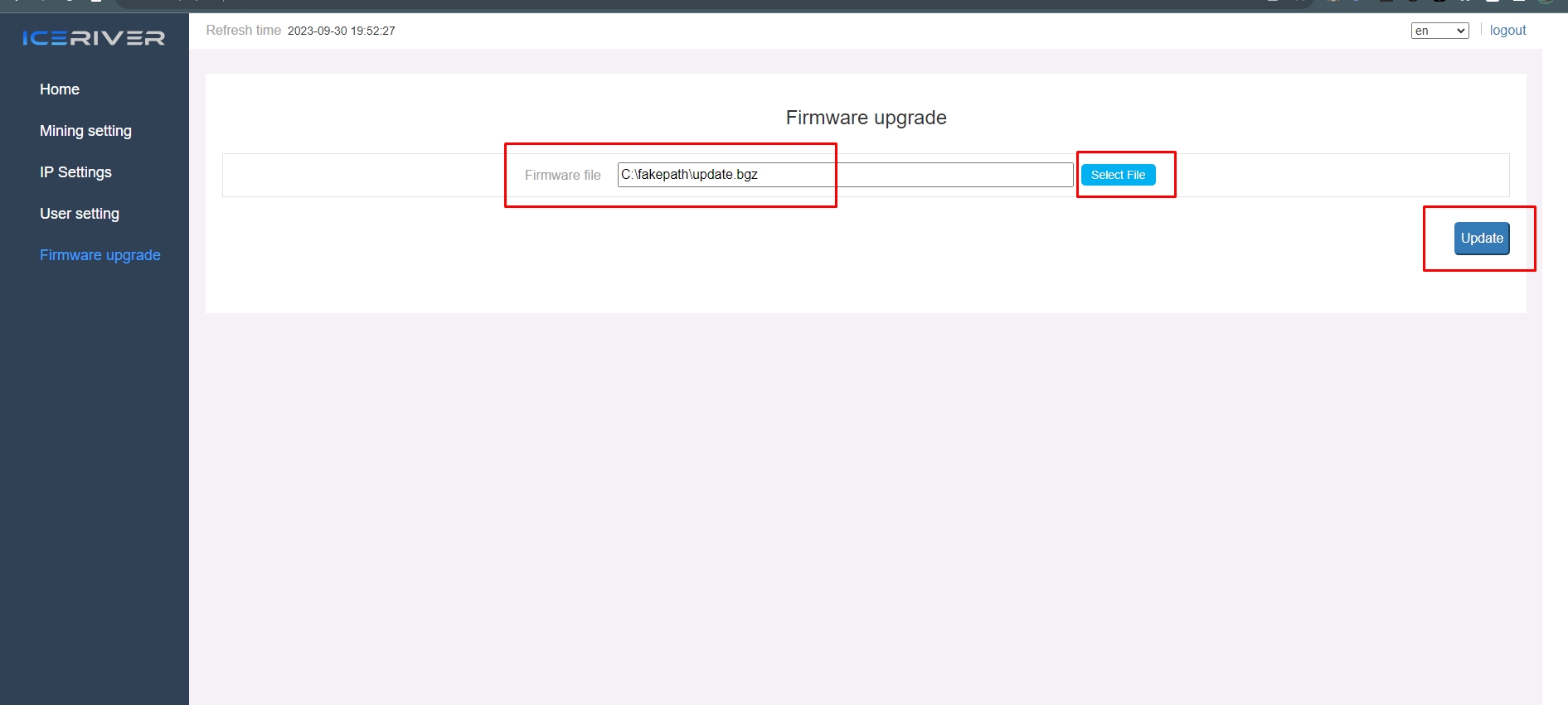 Загрузите файл miner.bgz (перетащите файл miner.bgz в папку /var/update) затем перезагрузите асик (можно через web браузер или физически отключить питание) и все готово.