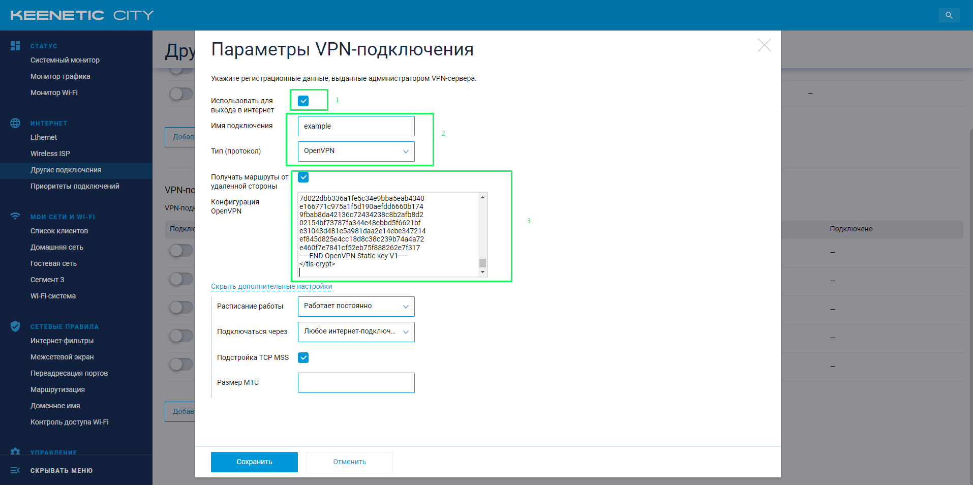 - копируем текст из файла конфига OpenVPN и вствляем в данное поле.