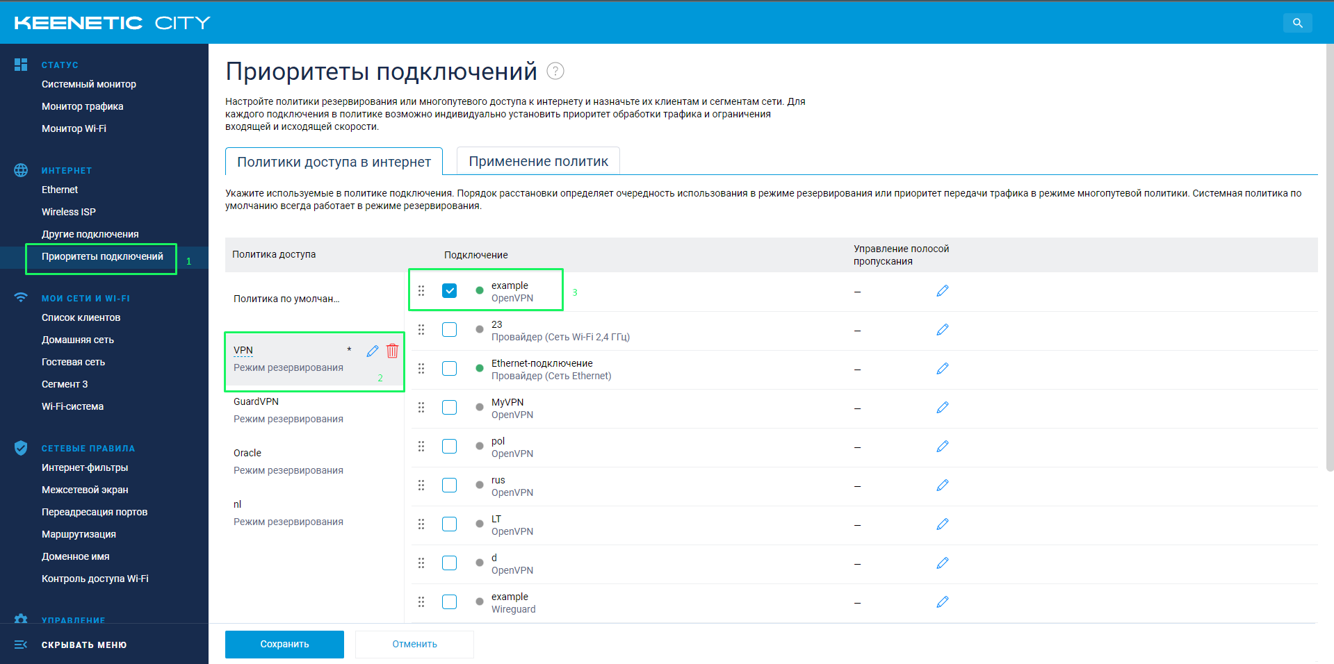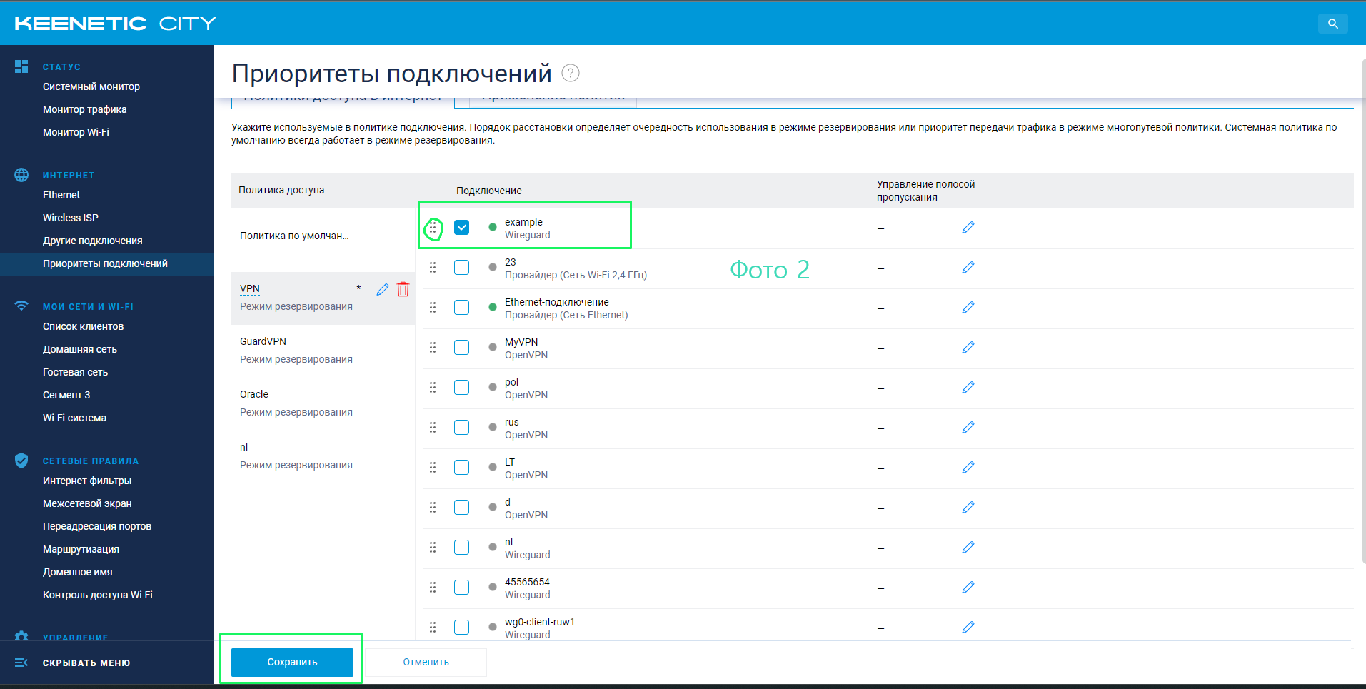 Ставим птичку на созданный ранее example VPN, перетаскиваем данный блок наверх за точки и нажимаем кнопку "Сохранить"