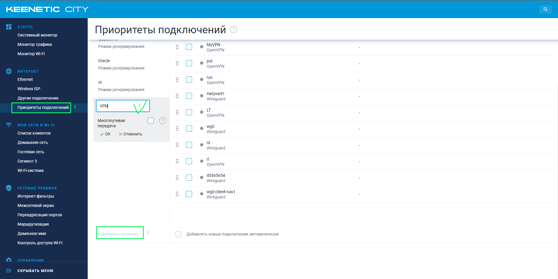 Затем выбираем "Приоритеты подключений" и нажимаем "+Добавить политику"