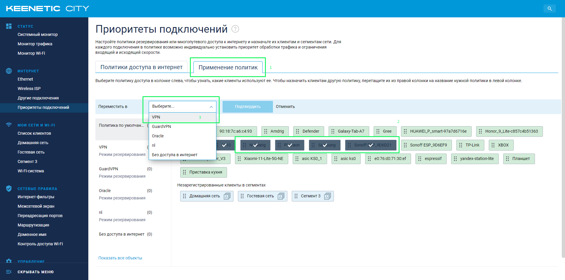 Выбираем нужные устройства, которые будут работать под VPN и перемещаем в созданный профиль VPN и нажимаек кнопку "Подтвердить"