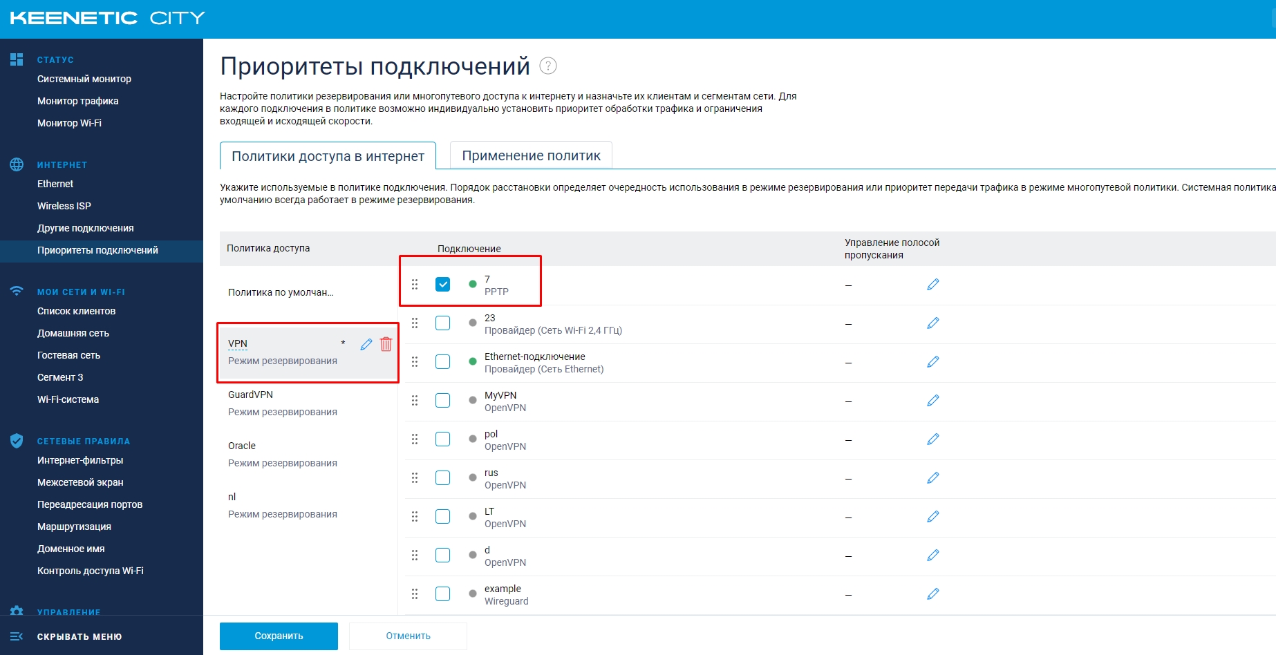 Затем выбираем "Приоритеты подключений" и выбираем вкладку "Политики доступа в интернет"