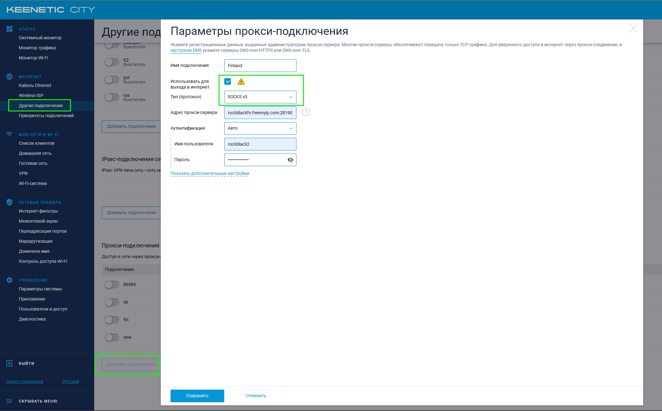 Затем нужно зайти меню - другие подключения и в Прокси-подключения нажать Добавить подключение