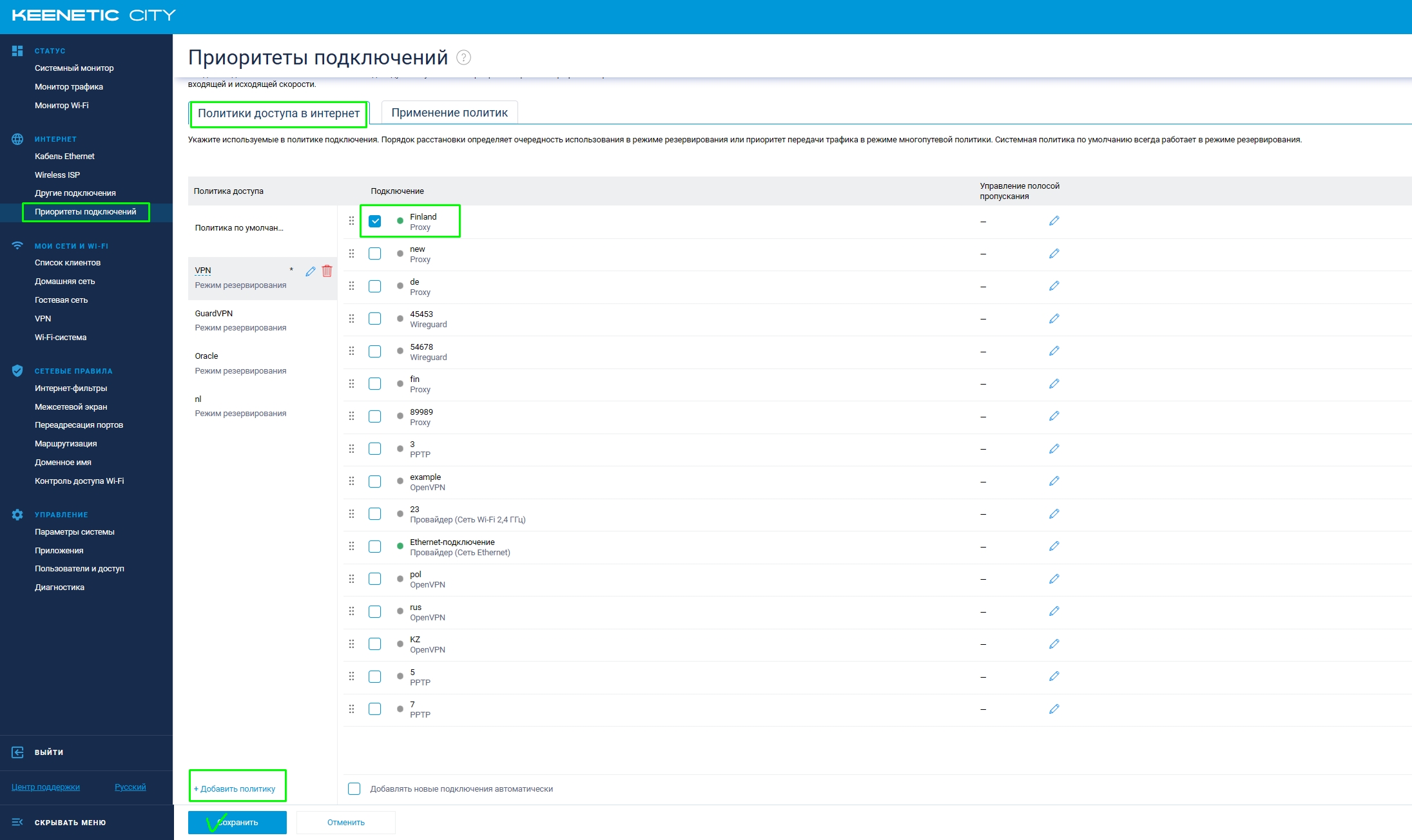 Нажимаем +Добавить политику, даем название, например VPN. Затем Ставим птичку на proxy socks Finland и перетаскиваем его в самый верх. Нажимаем кнопку Сохранить