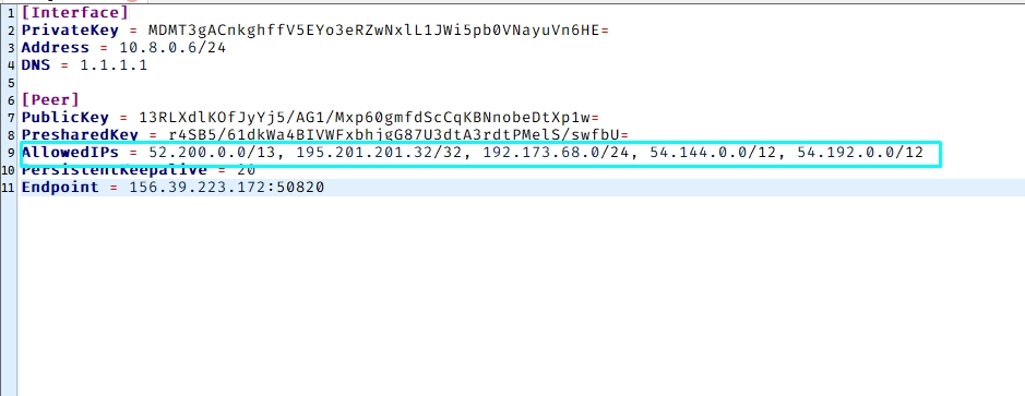 AllowedIPs = 195.201.201.32/32, 192.173.68.0/24, 54.144.0.0/12, 54.192.0.0/12